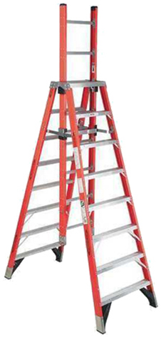 The E7400 Extension Trestle Ladders have a 300 pound duty rating per side and are designed for one or two-person jobs. The slip-resistant TRACTION-TRED® extra wide steps are knee-braced and double riveted. A spring-loaded locking mechanism makes maneuvering the extension trestle easy. The nylon-coated guide sleeves assure minimum friction and wear and also increase the ease of operation. External rail shields and the EDGE® bracing system help protect the rails. Fiberglass rails are non-conductive for working near electricity.